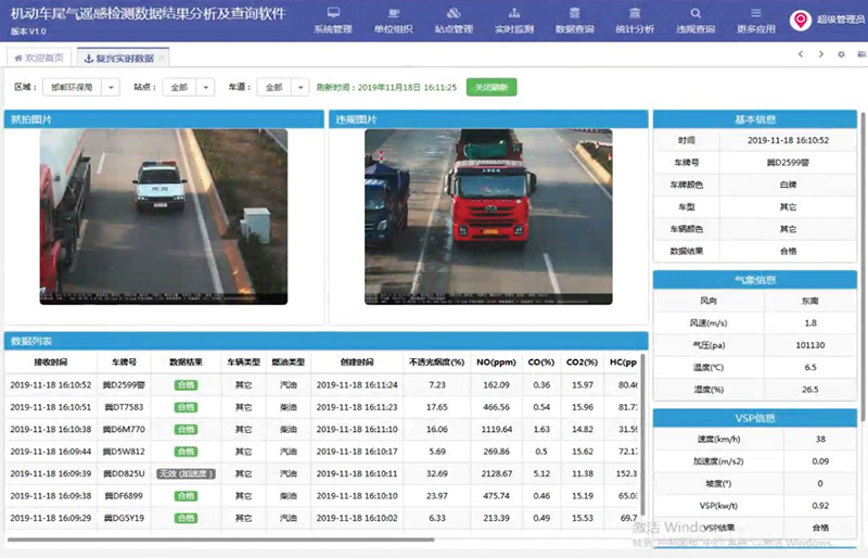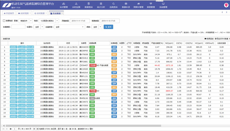 尾氣遙感檢測平臺實現(xiàn)了對機動車尾氣數(shù)據(jù)的采集、管理維護功能。可以實時查詢固定式站點監(jiān)測數(shù)據(jù)及移動式站點監(jiān)測數(shù)據(jù)。所監(jiān)測的數(shù)據(jù)信息涵蓋了機動車尾氣檢測參數(shù)值、氣象參數(shù)數(shù)據(jù)、環(huán)境空氣質(zhì)量數(shù)據(jù)、黑煙車數(shù)據(jù)等。同時結(jié)合環(huán)境空氣質(zhì)量數(shù)據(jù)與尾氣檢測數(shù)據(jù)進行統(tǒng)計分析,并與交管局、車管所進行數(shù)據(jù)庫對接。形成了實時查詢和匹配車輛基本信息于一體的數(shù)據(jù)檢測、統(tǒng)計、分析系統(tǒng)。