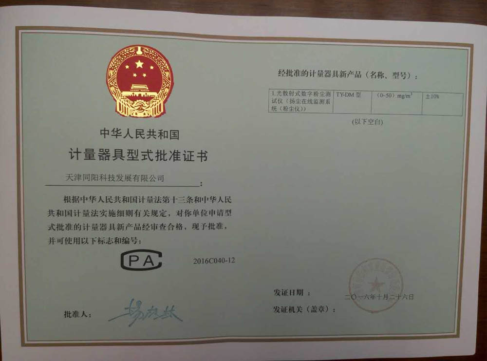 天津同陽(yáng)TY-DM型揚(yáng)塵在線監(jiān)測(cè)系統(tǒng)取得計(jì)量器具型式批準(zhǔn)證書(shū)