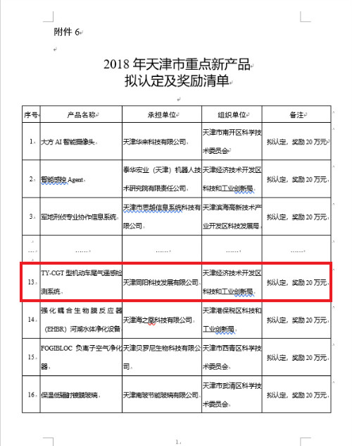 同陽科技榮獲2018年“天津市重點(diǎn)新產(chǎn)品”稱號