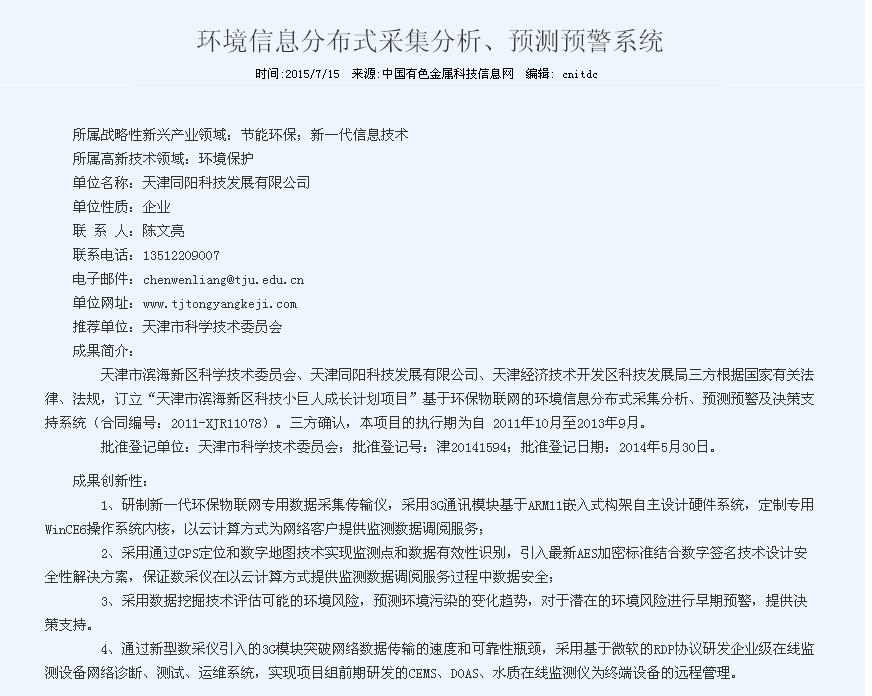 同陽科技獲得天津市濱海新區(qū)科學技術進步獎 更新時間:2015-07-15 點擊:21822 所屬欄目:公司新聞 Update Time:2015-07-15 Hits:21822 Belong Column:News 天津同陽科技申報的“環(huán)境信息分布式采集分析、預測預警系統(tǒng)”項目,獲得天津市濱海新區(qū)科學技術進步三等獎。