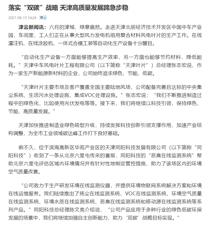 近日,津云新聞以“落實‘雙碳’戰(zhàn)略 天津高質(zhì)量發(fā)展蹄急步穩(wěn)”為題,對同陽科技進行了宣傳報道。