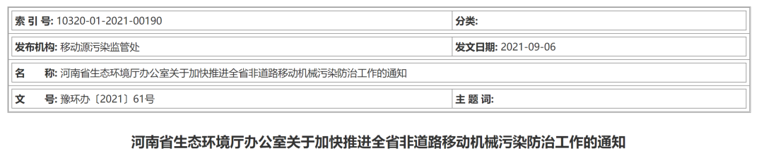 河南省生態(tài)環(huán)境廳于近日發(fā)布的《河南省生態(tài)環(huán)境廳辦公室關(guān)于加快推進(jìn)全省非道路移動(dòng)機(jī)械污染防治工作的通知》中提出力爭在2021年底前完成20萬臺非道路移動(dòng)機(jī)械的信息采集、環(huán)保標(biāo)識下發(fā)和現(xiàn)在監(jiān)控設(shè)備安裝等工作。經(jīng)過深度治理,非道路移動(dòng)機(jī)械顆粒物在線數(shù)據(jù)可達(dá)到《非道路柴油移動(dòng)機(jī)械排氣煙度限值及測量方法》(GB36886-2018)規(guī)定的Ⅲ類限值,并對顆粒物排放數(shù)據(jù)實(shí)現(xiàn)在線監(jiān)測數(shù)據(jù)與省、市管理平臺聯(lián)網(wǎng)。還同時(shí)要求了嚴(yán)格執(zhí)行非道路移動(dòng)機(jī)械的監(jiān)督抽查工作等內(nèi)容。