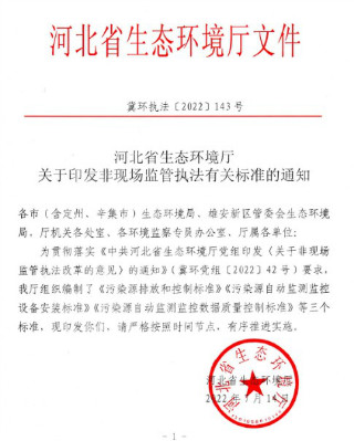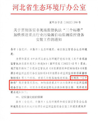為持續(xù)貫徹生態(tài)環(huán)保部的《關(guān)于優(yōu)化生態(tài)環(huán)境保護(hù)執(zhí)法方式提高執(zhí)法效能的指導(dǎo)意見》,2022年,河北省編制了《污染源自動排放和控制標(biāo)準(zhǔn)》《污染源自動監(jiān)測監(jiān)控設(shè)備安裝標(biāo)準(zhǔn)》《污染源自動監(jiān)測監(jiān)控數(shù)據(jù)質(zhì)量控制標(biāo)準(zhǔn)》等三個標(biāo)準(zhǔn),同年7月,河北省生態(tài)環(huán)境廳辦公室印發(fā)《關(guān)于貫徹落實非現(xiàn)場監(jiān)管執(zhí)法“三個標(biāo)準(zhǔn)”加快推進(jìn)重點行業(yè)污染源自動監(jiān)測監(jiān)控設(shè)備安裝工作的通知》(冀環(huán)辦字函(2022)290號),指出要“加快推進(jìn)重點行業(yè)污染源自動監(jiān)測監(jiān)控設(shè)備安裝工作,切實為非現(xiàn)場監(jiān)管執(zhí)法提供數(shù)據(jù)支撐”。